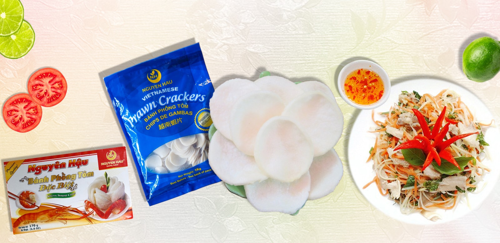 Là sản phẩm mang dấu ấn của thương hiệu Nguyên Hậu, bánh phồng tôm được làm từ tôm tươi, bột năng và các gia vị truyền thống. Sản phẩm có nhiều kích cỡ, phù hợp với tiêu chuẩn nội địa và xuất khẩu, được ưa chuộng tại nhiều thị trường như Hàn Quốc, Nhật Bản, Trung Quốc và EU.